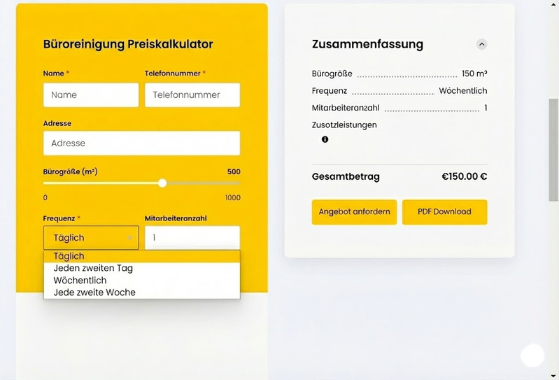 - Art der Reinigung: Unterhaltsreinigung (Standard), Grundreinigung oder Fensterreinigung.